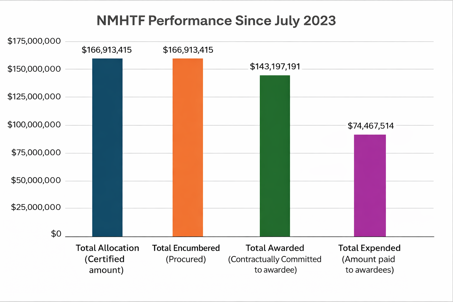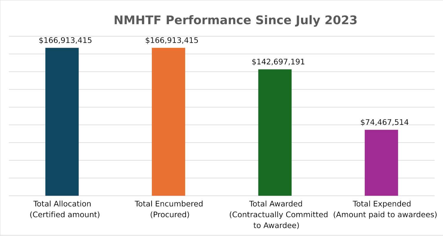 Of the $167 million in allocations to the NMHTF since July 2023, 100% is encumbered (designated for use), 85% is awarded (contractually committed), and 45% is expended, as of December 31, 2025. When funding is awarded, affordable housing projects and programs can begin development and implementation. Expenditure will then follow on a reimbursement basis.